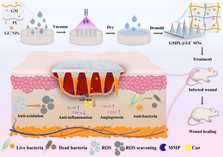 该研究聚焦于细菌感染性伤口这一临床治疗难题,创新性地开发了一种金属蛋白酶响应性的明胶/聚赖氨酸水凝胶微针贴片。研究团队采用模板辅助逐层固化技术,构建了以甲基丙烯酰化明胶为网络骨架的水凝胶微针基质,并同时嵌入具有广谱抗菌活性的ε-聚赖氨酸,以及负载姜黄素的金属蛋白酶敏感型明胶纳米颗粒,从而集成形成了抗菌-响应-释药一体化的智能递送系统。其核心作用机制在于:当该微针作用于感染伤口时,伤口微环境中过度表达的金属蛋白酶能够特异性水解微针内的明胶纳米颗粒,从而触发所包裹的姜黄素药物按需精准释放。释放的姜黄素可高效清除伤口处过量的活性氧,抑制过度炎症反应,并协同调节血管生成过程,多维度协同改善伤口愈合微环境。实验结果表明,这种具备智能响应与按需释药能力的多功能微针,能有效减轻组织氧化应激损伤,加速伤口由炎症期向增殖修复期转化。在细菌感染伤口模型中,其可将伤口闭合率显著提升至99.1%。该研究成果不仅为慢性感染伤口的临床治疗提供了一种具应用潜力的新策略,也智能响应型生物材料在组织工程与创面修复领域的深入应用开辟了新的方向。
