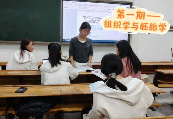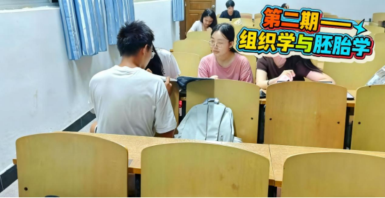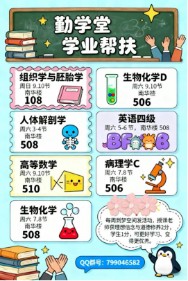 本学期“勤学堂”聚焦学生普遍反映的学习难点,系统开设《组织学与胚胎学》《生物化学》《人体解剖学》《高等数学》及大学英语四级等核心课程辅导。活动于每周固定时间在南华楼多间教室开展,由学业优秀的同学担任“小老师”——他们依托扎实的学习功底,通过知识串讲、例题剖析与经验分享,帮助同学们厘清思路、突破瓶颈。