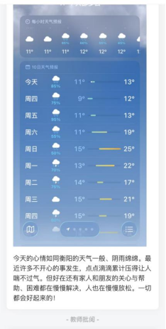 本次活动以线上平台为依托,创新采用“情绪天气化”的表达形式,参与学生每日可根据自身心境,选择晴、阴、雨、雪等天气符号定义当日情绪,同时以图文结合的方式,记录下影响情绪的点滴事件。这一趣味形式打破了情绪表达的心理壁垒,让同学们更轻松地直面内心感受,在日常记录中学会觉察情绪、接纳情绪,逐步培养积极健康的心理状态。