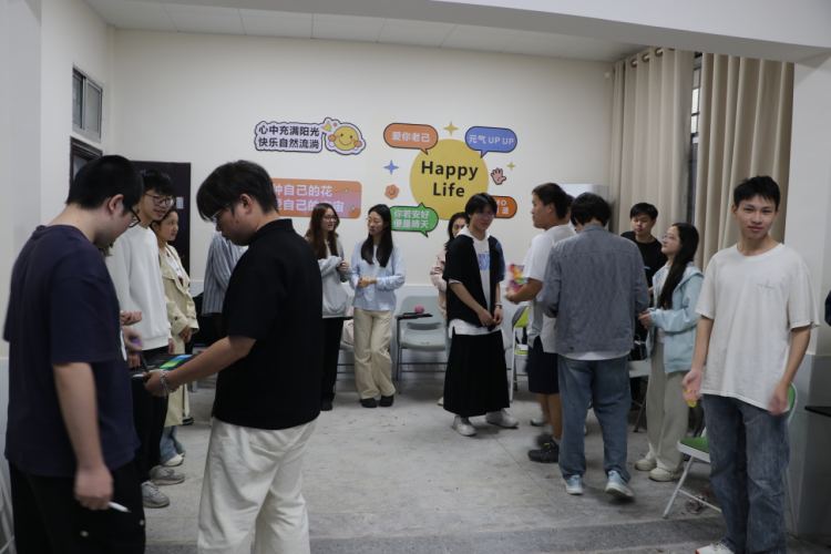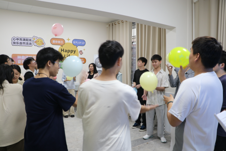 针对大一、大二学生学业压力突出的现状,活动特别设置团体辅导环节。在蒋老师的带领下,同学们依次参与了“进化论”“压力气球大爆破”“解忧杂货铺”“抖动释放法”等趣味互动游戏,在轻松欢快的氛围中释放压力,交流困扰解决之道。活动尾声,全体成员手拉手围成“能量圈”,分享自己的收获和体会,现场充满温暖与力量。