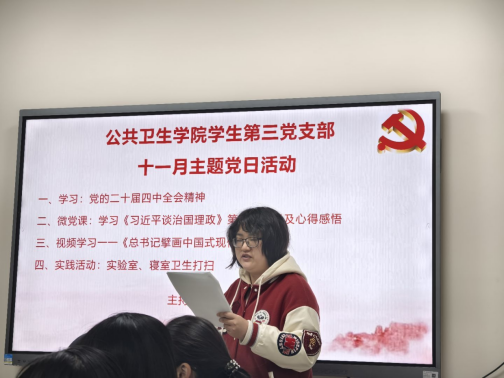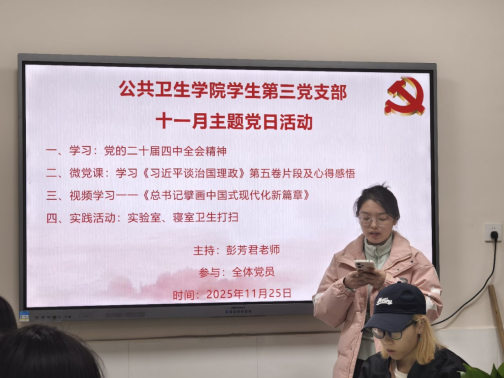 2025年11月25日下午3点,PA视讯平台学生第三党支部在第二办公楼121成功召开十一月主题党日活动与支部大会,组织全体在校党员深入学习党的二十届四中全会精神,开展《习近平谈治国理政》第五卷微党课学习,观看专题视频《总书记擘画中国式现代化新篇章》,并顺利完成接收田清珍同志为预备党员的议题。
